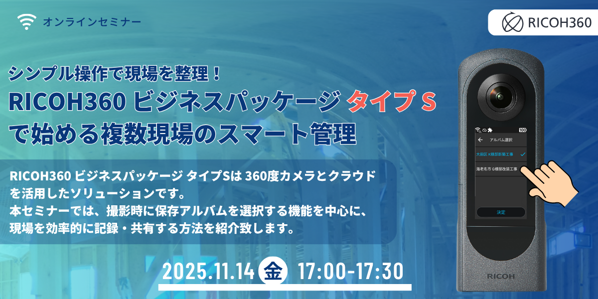 現場の整理・管理をシンプル操作で効率化できる「RICOH360 ビジネスパッケージタイプ S」を紹介するオンラインセミナーを開催します。住宅・建設・設備工事の現場調査・施工管理・施工記録など、複数現場の情報共有や記録業務の課題を、撮影から共有まで一気に解決する最新ソリューションをご紹介します。