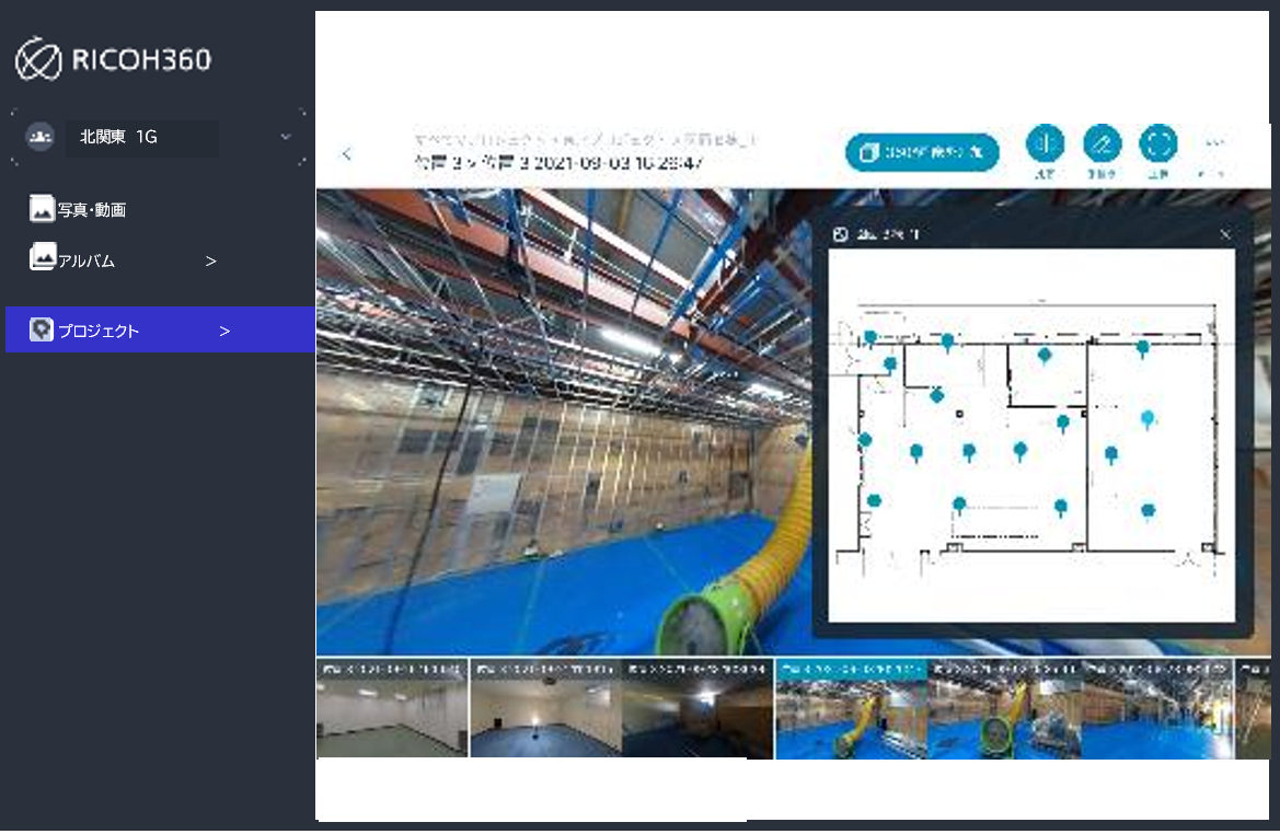 図面をクラウドに登録し、撮影した360度画像をその図面上に紐づけ可能。
