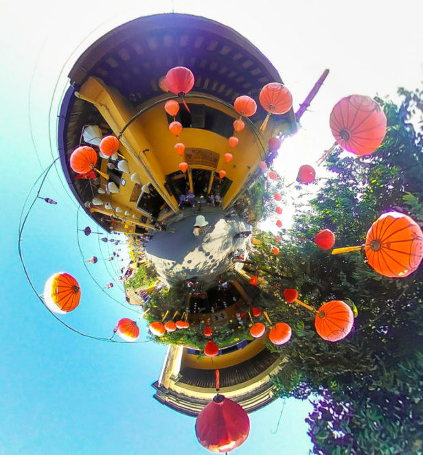 スマホのパノラマ撮影のように、カメラを動かして撮影する必要があると思われることが多いのですが、その必要はなく「ボタン1ショット」でこのような360°写真を撮影することができるのです!