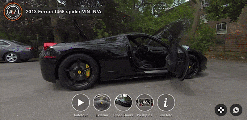 These digital replicas uses 360 car photography to replace rudimentary digital tours with a truly interactive user experience allowing viewers to open all doors & compartments, virtually walk through doorways, examine the engine, step inside of the trunk, and interact with precise pushpins that highlight special features and document the vehicle's exact condition.